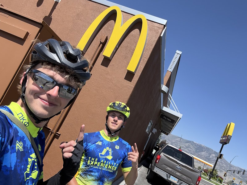Pretty easy 60-miler today into Vernal. The scenery changed completely from forest to red desert, which was very beautiful. After showers and laundry, the team hiked to a cliff jumping spot in Red Fleet State Park – the jump was almost 50 feet!. The area is known for its fossils, and we saw some fossilized dinosaur footprints on our hike. We're staying at the Vernal Elk Lodge tonight. Big day tomorrow!